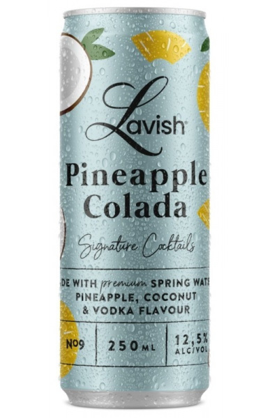 Lavish Pineapple Colada is een licht koolzuurhoudende cocktail met vodka smaak. Gemaakt met premium bronwater, zoete, rijke ananas en kokosnoot vodka smaak. Lavish Pineapple Colada bevat 12,5% alcohol en is verpakt in een mat, kleurrijk blikje van 250 ml.